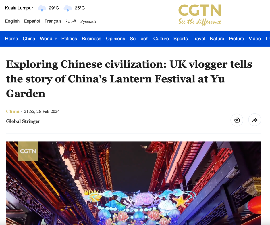 我校数学学院英国博士留学生Luke Johnston在上海豫园拍摄的元宵节灯会的短视频,被央视CGTN转载,并作为“老外看中国文明”封面故事推荐。