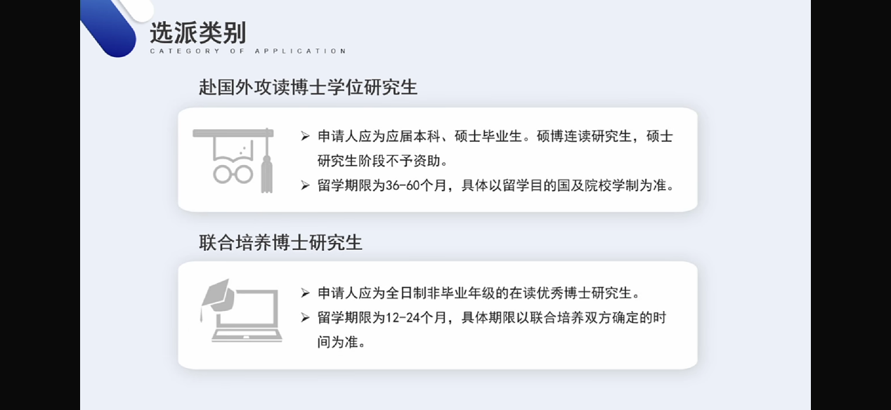 1. 赴国外攻读博士学位研究生(含博士研究生和硕博连读研究生, 硕士研究生阶段不予资助):留学期限为36-60个月,具体以留学目的国及院校学制为准;