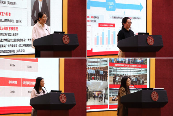 在答辩展示环节,医学院附属第一人民医院、基础医学院和教育学院的分管领导分别就单位的研究生教育工作情况、管理服务成效、人才培养创新等内容进行了全面汇报。13名研究生教务老师立足岗位实际,结合个人岗位职责、服务效能、工作创新及实际成果进行了精彩展示。